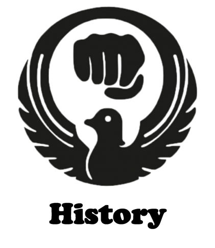 Background is Japanese calligraphy for "Kara  Te" - Empty Hand
